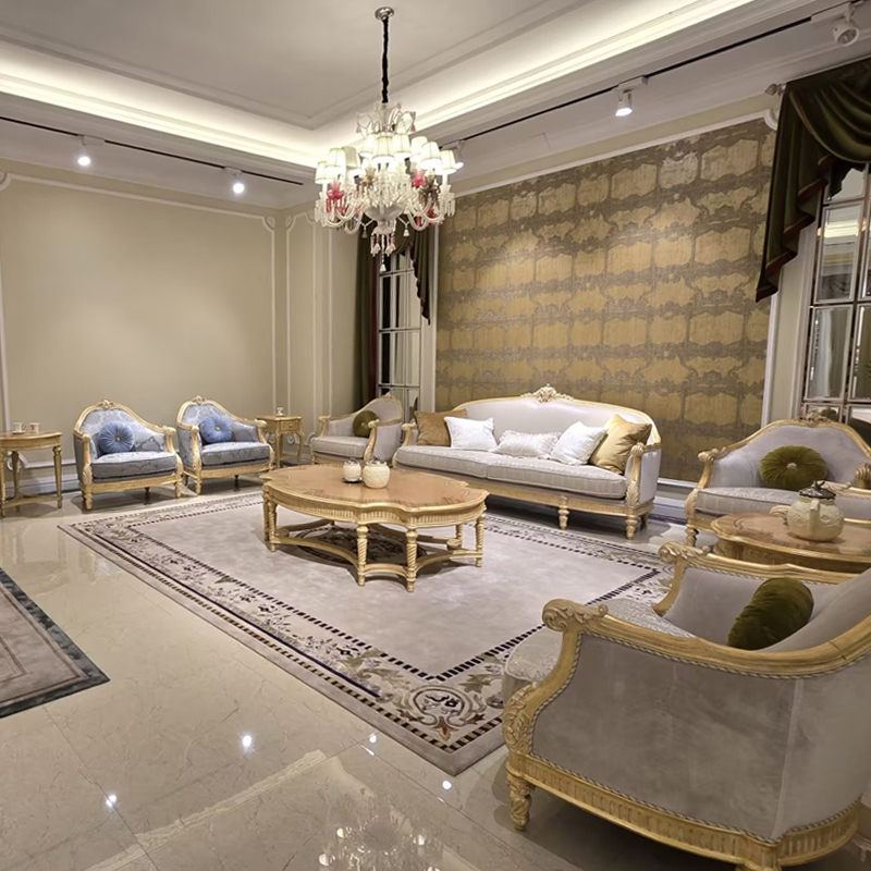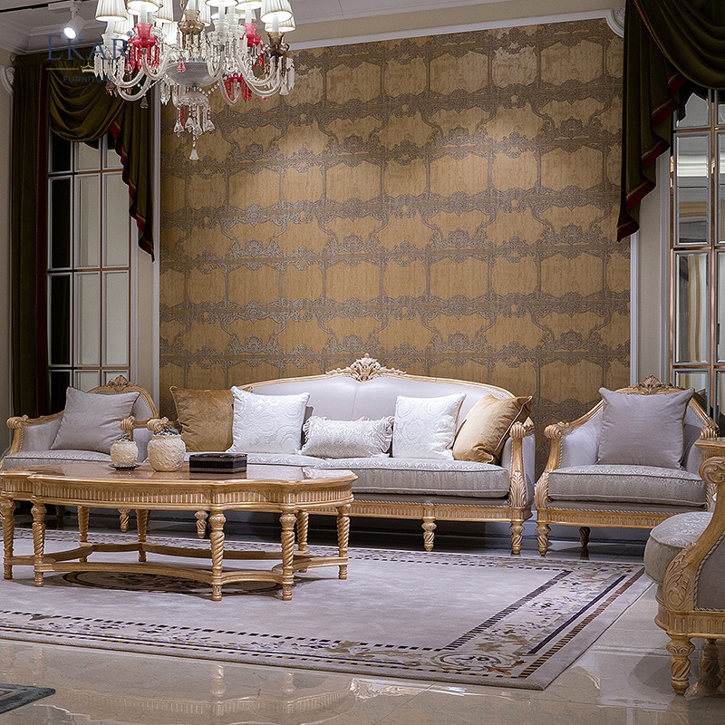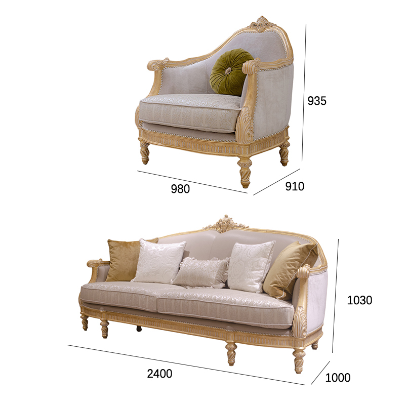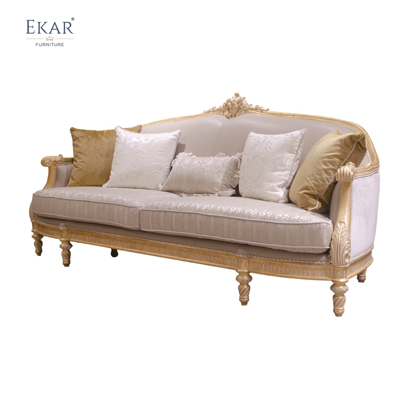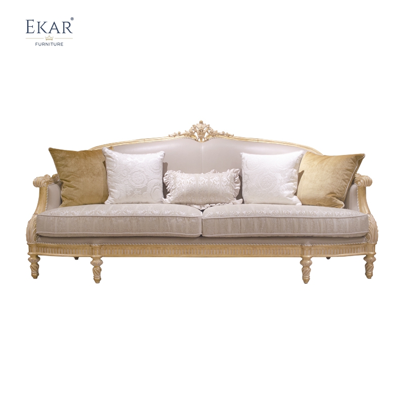 French classic leather cushion sofa with plush seat, solid wood carved frame