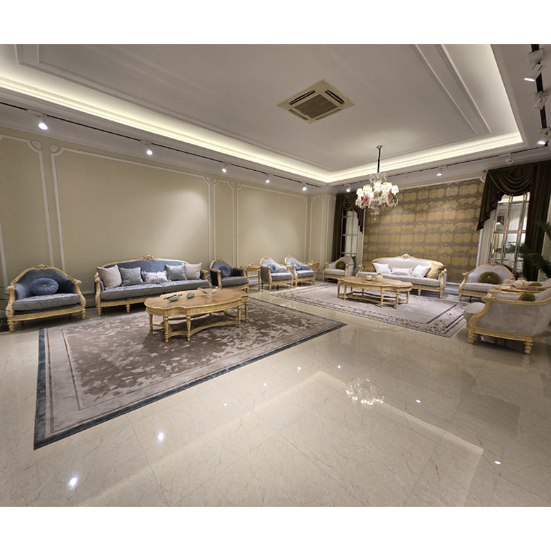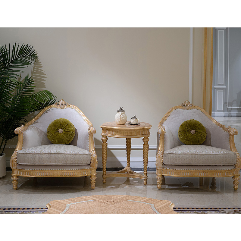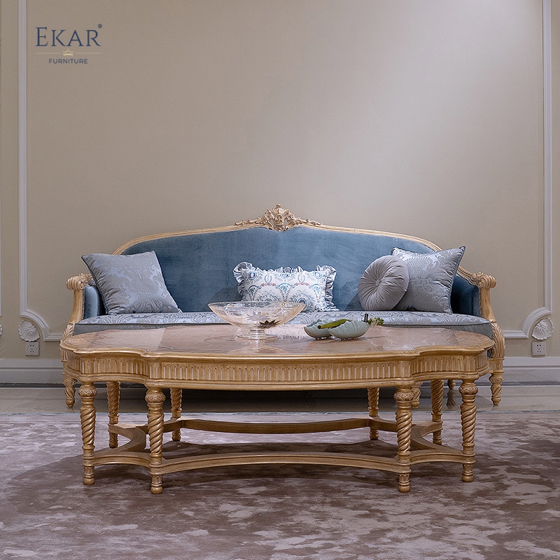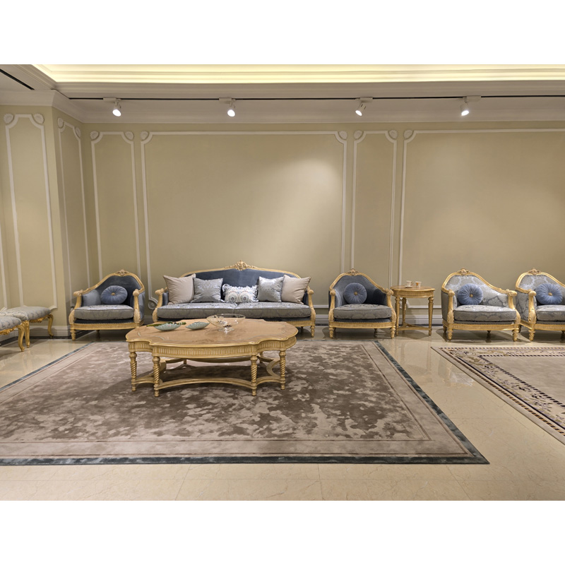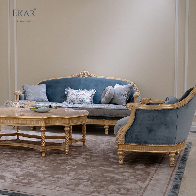 French classic leather cushion sofa with plush seat, solid wood carved frame